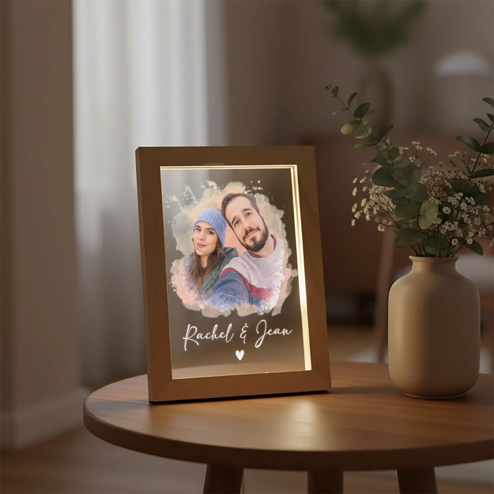 A timeless way to light up your memories. This personalised LED photo frame is crafted from natural wood and clear acrylic, featuring your chosen photo professionally printed for a warm, elegant glow.
